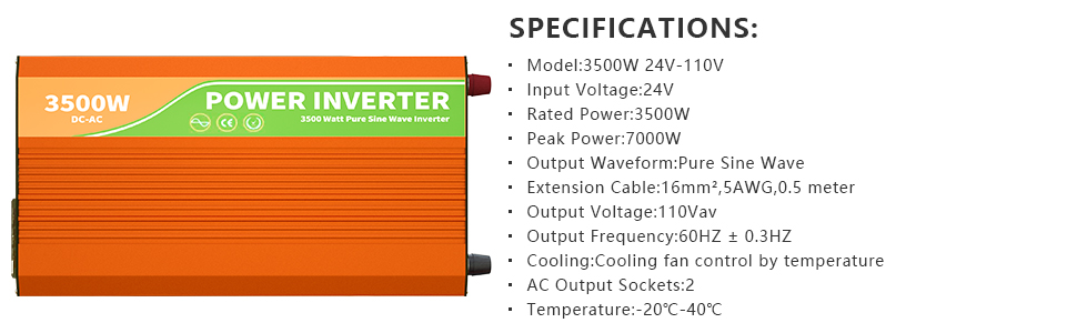 Advanced pure sine wave technology provides stable AC equivalent to grid power which will protect and extend the lifespan of your electronics and appliances. Rated power 3500W, peak 7000W for the surge during start-up. Over 91% of conversion efficiency, converts 24VDC to 110VAC.