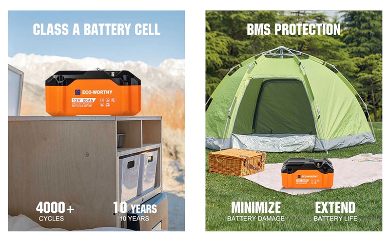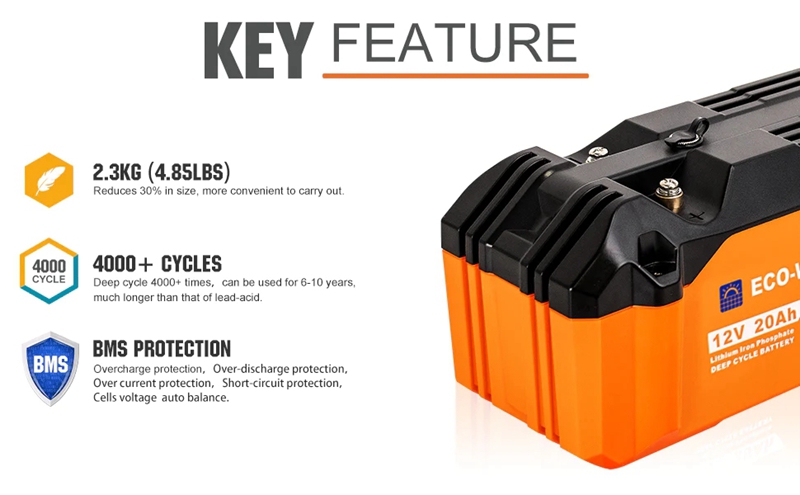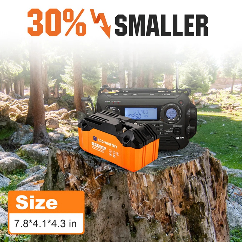 ·Longer Life Span: Up to 80% capacity for 3000 cycles in recommended conditions. The typical SLA has 300-400 cycles. ECO-WORTHY Lithium batteries last so long that the price per use is a fraction of traditional batteries.·Lightweight Champion: Our lithium battery is only 1/3 of the weight of a lead-acid battery, easy to move and install. It is an ideal choice for outdoor camping power supply and simple indoor installation.·High Efficiency: It provides up to 95% of their rated capacity while a lead-acid battery is usually limited to 50%. You get all the juice down to the last drop. It can support fast charging or solar panel charging.·Extremely Safe: LiFePO4 batteries are safest battery type available today. ECO-WORTHY lithium battery has a built-in Battery Management System(BMS), we can guarantee the safety and reliability of our batteries.·Wide Application: Suitable for RVs, Solar systems, off-grid, Boats, Fish finders, Power wheels, Scooters, Industry, Hiking, Camping, Backup power supply, etc.