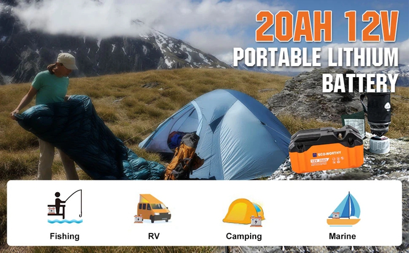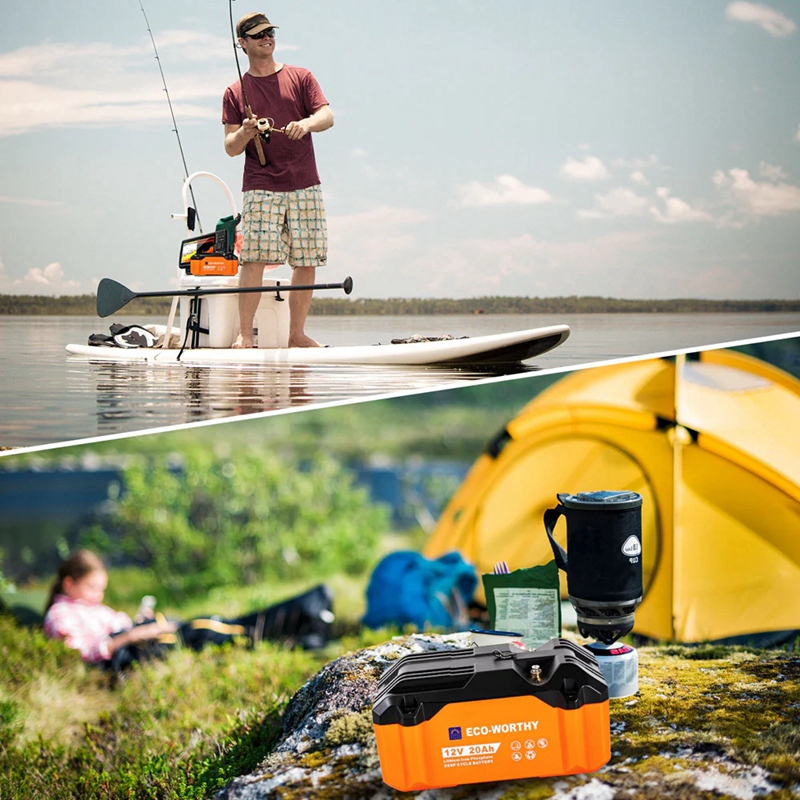 ECO-WORTHY 12V 20Ah Portable LiFePO4 Deep Cycle Rechargeable Battery is suitable for various outdoor applications: fishfinder, trolling motor, camping, RV, boat, ect.