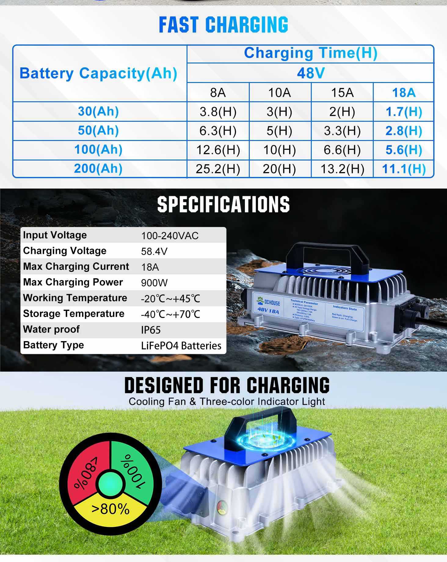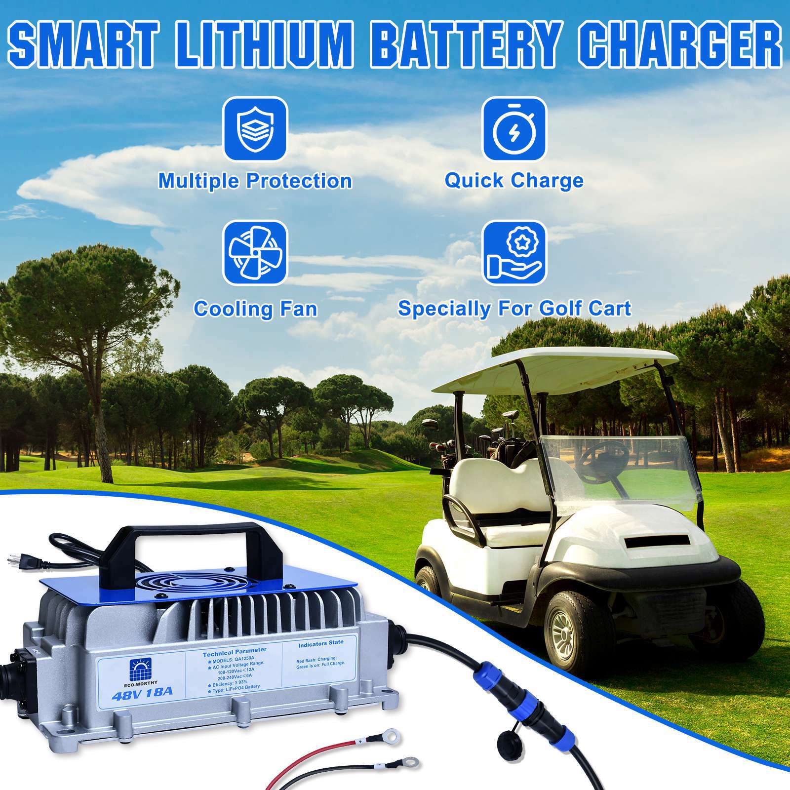 -Golf Cart Battery Charger: 48V lithium battery charger, designed for 48V golf cart lithium batteries. 18A current fast charging, can be safely and quickly for 48V 50Ah lithium battery fully charged within 2.8 hours, also fully applicable to sightseeing trucks, forklifts, logistics trucks, all-terrain vehicles, marine, and other 48V lithium batteries for cyclic charging.