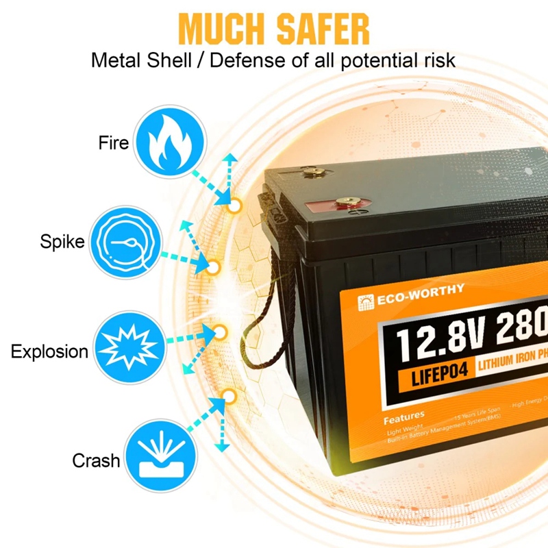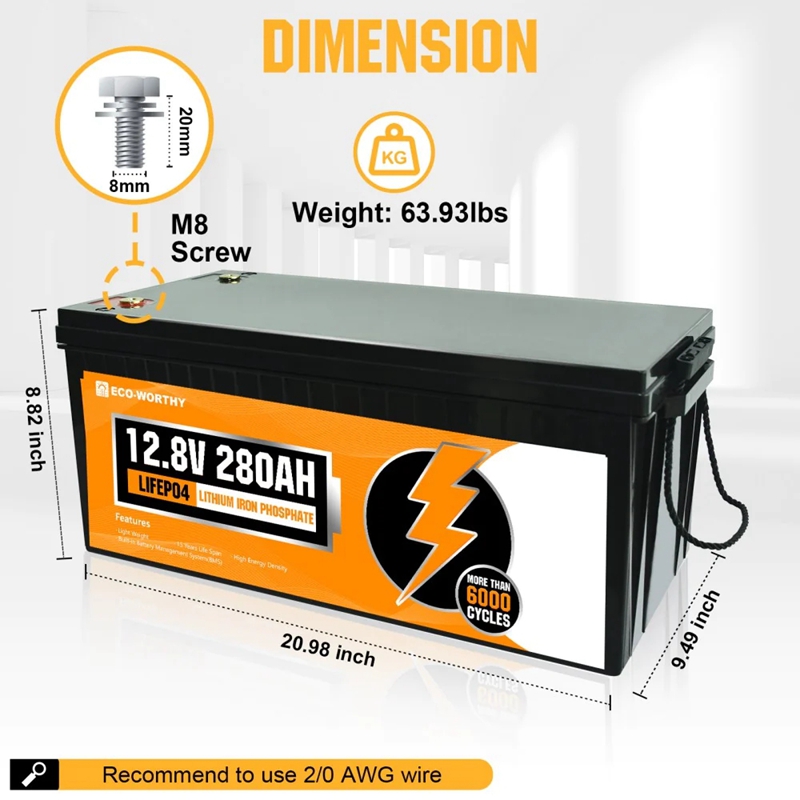 ECO-WORTHY LiFePO4 12V Lithium Iron Phosphate Battery has twice the power, half the weight, and lasts 8 times longer than a sealed lead acid battery, no maintenance, extremely safe and very low toxicity for environment. Our line of LiFePO4 offer a solution to demanding applications that require a lighter weight, longer life and higher capacity battery.12v280ah lithium battery