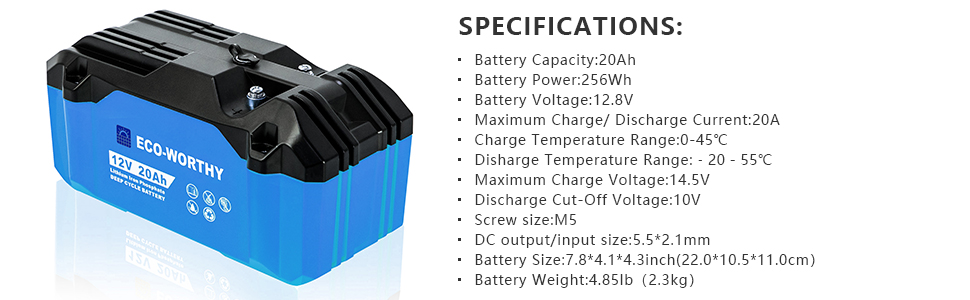 ECO-WORTHY 12V 20Ah Portable LiFePO4 Deep Cycle Rechargeable Battery is suitable for various outdoor applications: fishfinder, trolling motor, camping, RV, boat, etc. No maintenance, extremely safe, and very low toxicity for the environment. Reliable quality guarantee with UN38.3 and CE certificate. Our 20Ah Portable LiFePO4 offers a solution to demanding applications that require a lighter weight, longer life, and larger capacity battery.