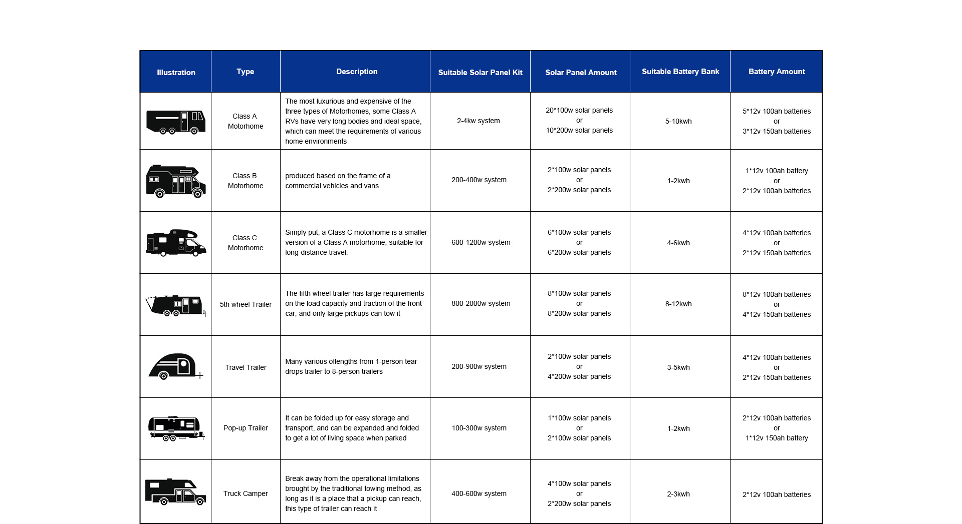 The most advanced and efficient solar battery chemistry is the Lithium Iron Phosphate (LiFePO4) battery, its size, capacity, and cycle times all perfectly match the RV's needs.